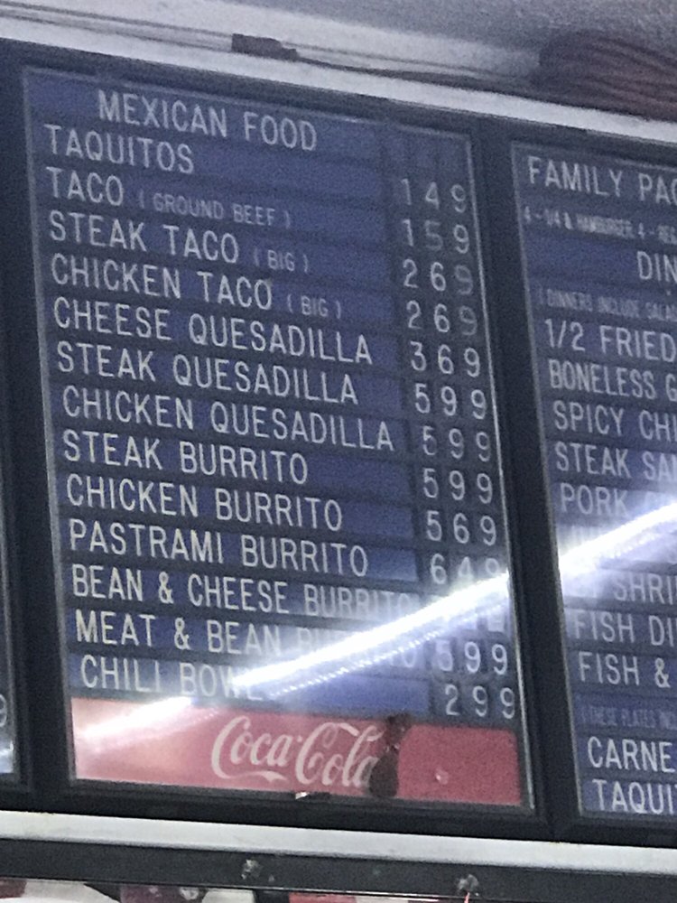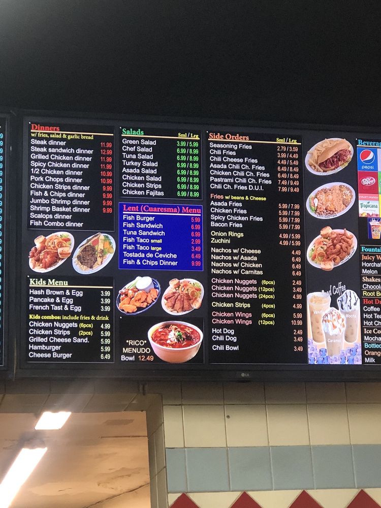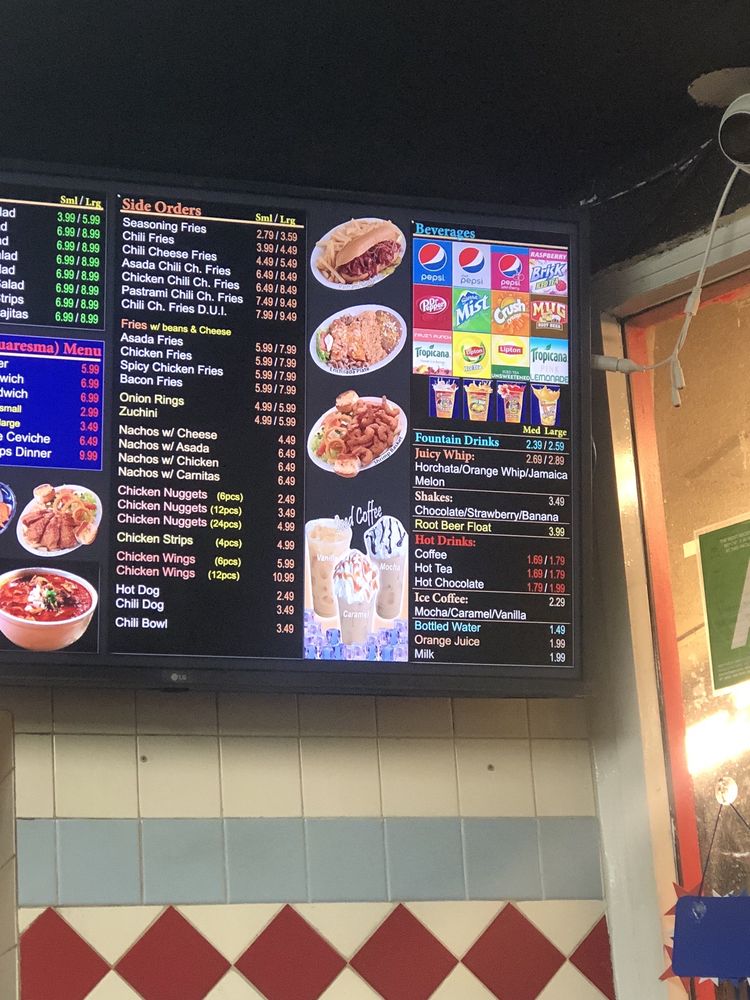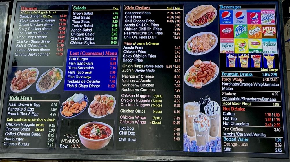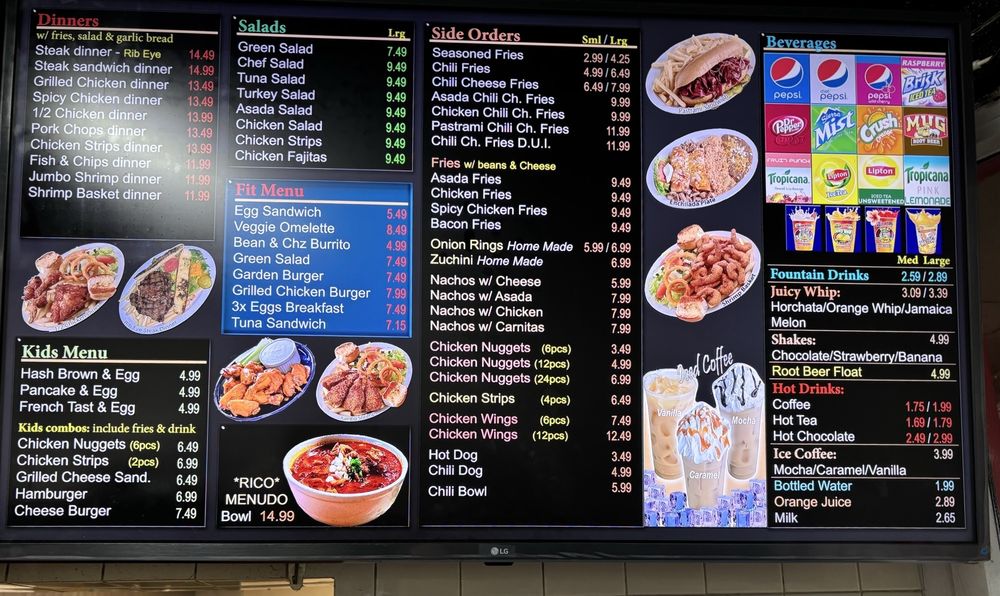 Fountain sodas available in small or large. Choose from Pepsi, Diet, Sierra Mist, Cherry, Dr. Pepper, Root Beer, Orange Crush, and more including fruit flavors, teas, Horchata, Orange Whip.